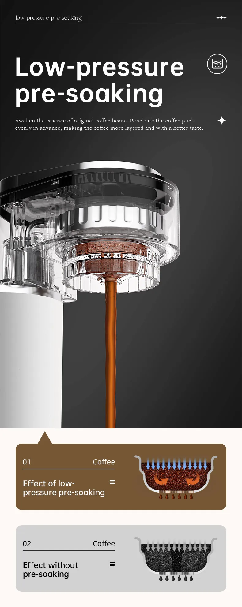 ★ 【 Pre-soaked Coffee Powder 】 : Professional low-pressure pre-soaking to awaken the essence of the original coffee beans. Penetrate the powder compact evenly in advance to make the coffee more layered and flavorful.